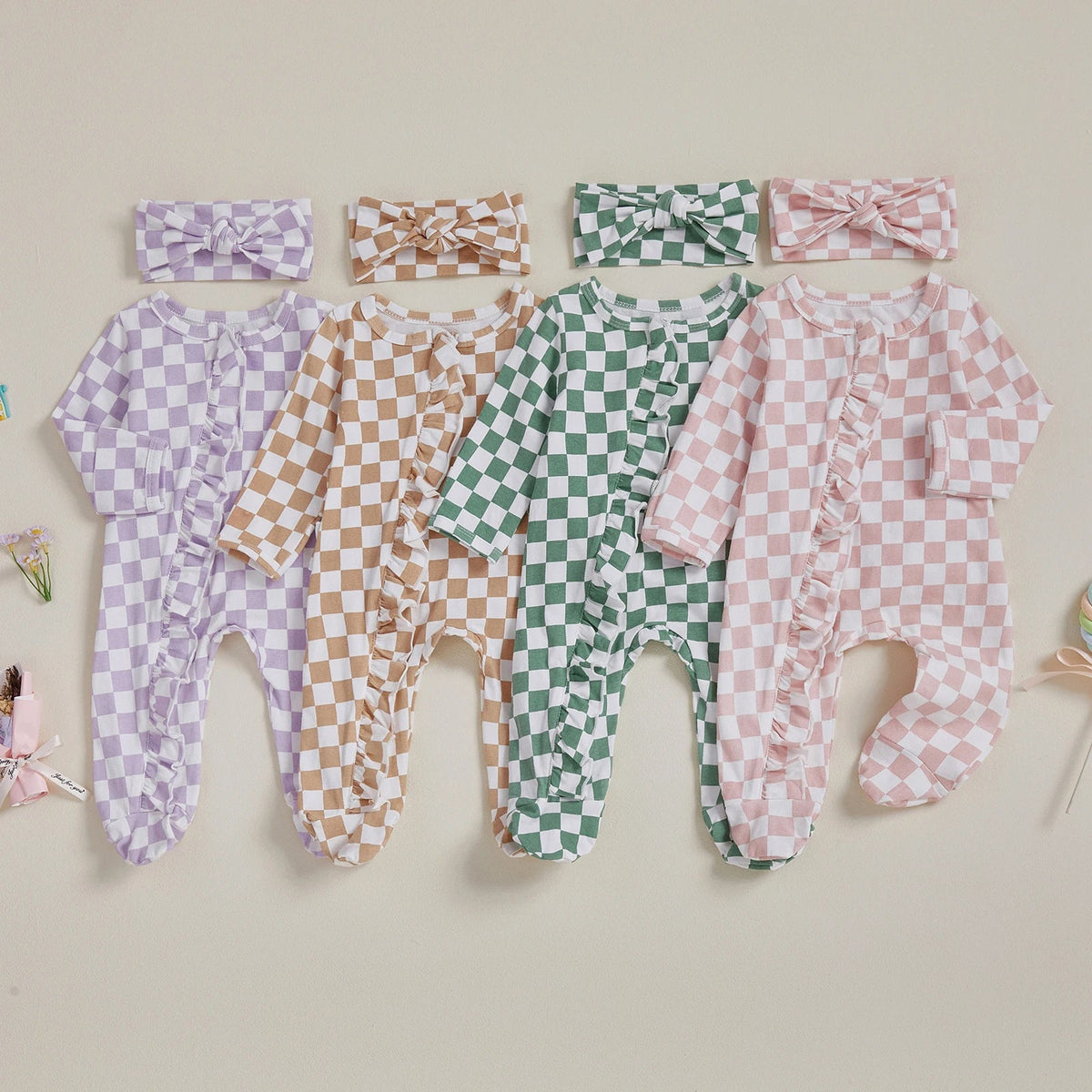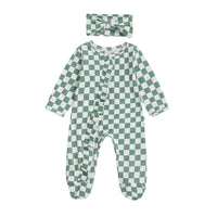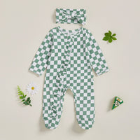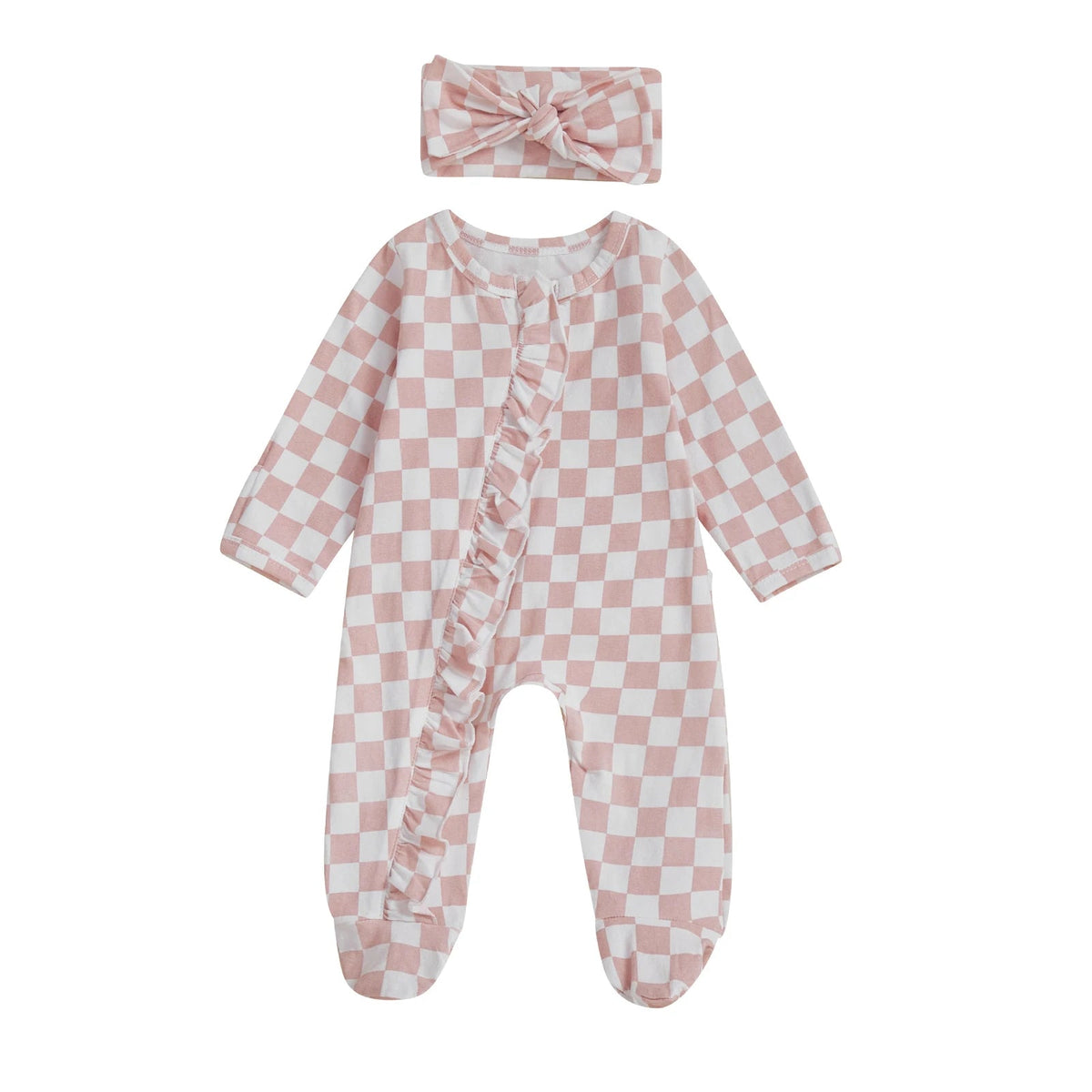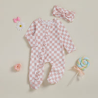 This baby girl’s footie set features a stylish checkerboard pattern that adds a modern touch to her wardrobe. Designed with expert attention, it includes a matching bow headband for a coordinated look. Subtle ruffle details along the zipper and on the booty add a delicate, charming finish, ensuring both comfort and style for your little one.