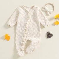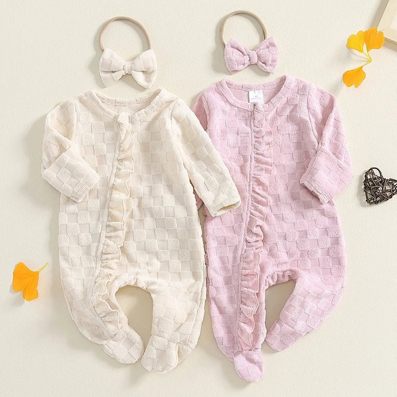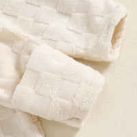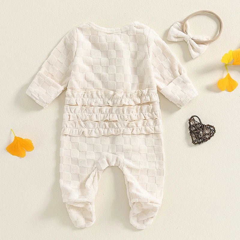 This ultra-soft terry cloth footie set brings a playful twist with its checkered design and cozy texture. Lightweight yet warm, it's perfect for lounging, napping, or everyday adventures. Includes a matching accessory for extra charm.