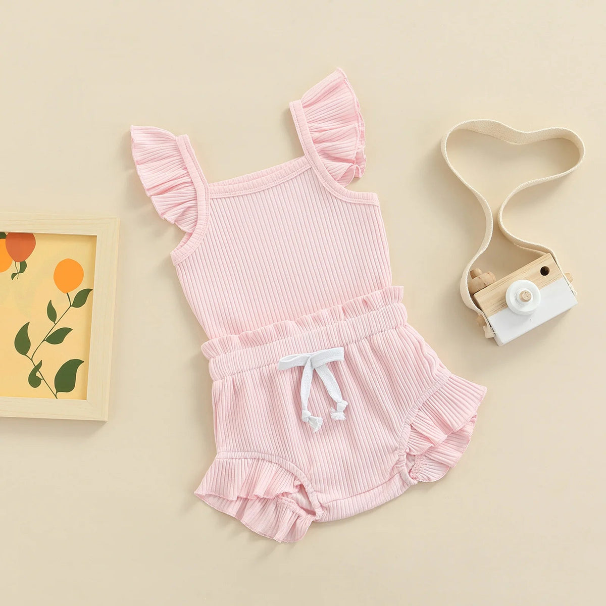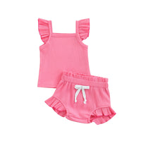 This Fly Sleeve Ribbed Ruffle Set comes in adorable spring colors and offers both comfort and style. The ruffle detail on both the shorts and sleeves add a unique touch to this set. Perfect for babies and toddlers.