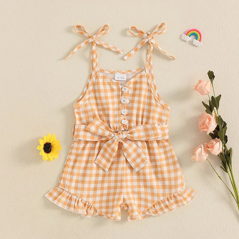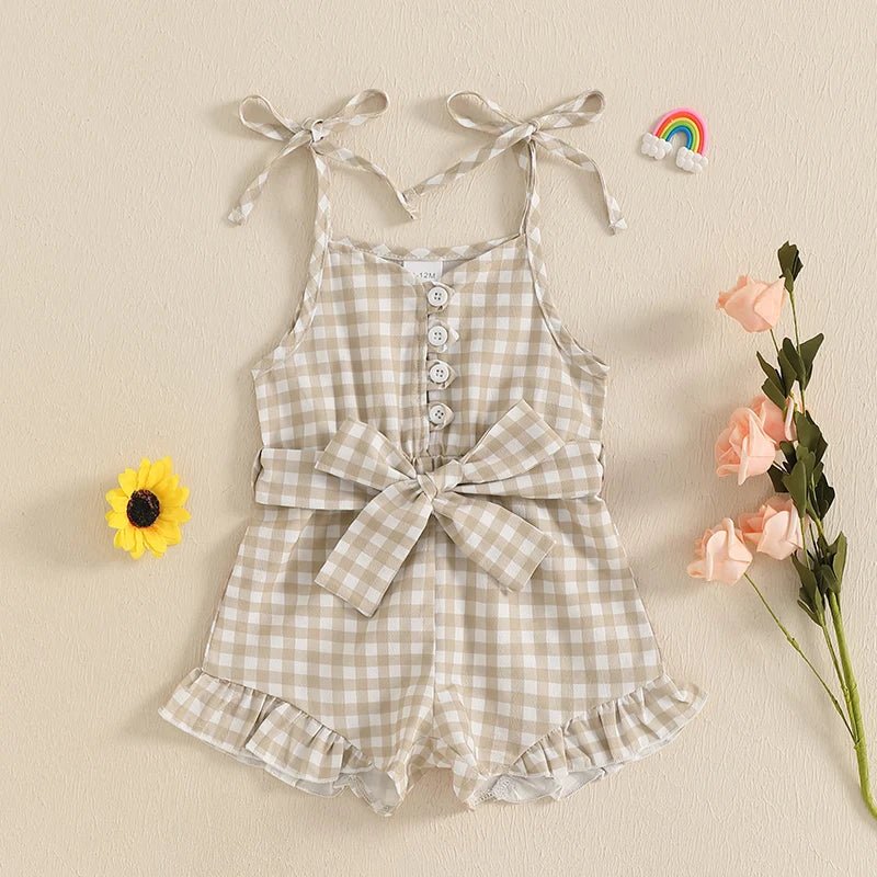 Timeless gingham with a modern twist. This romper features tie straps, a cinched waist with bow tie, and ruffle trim at the hem—making it a perfect pick for sunny-day outings and family photos.