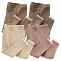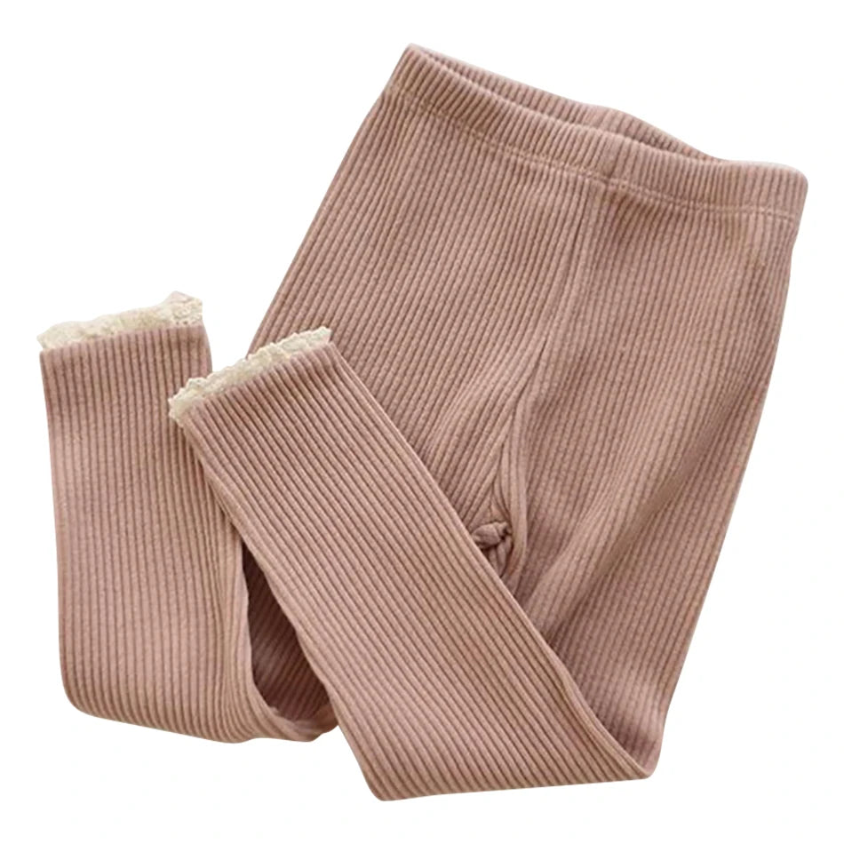 These Ribbed Lace Leggings feature a comfortable elastic waistband and delicate ribbed fabric with a charming ruffle detail around the ankle. Designed specifically for baby and toddler girls, they offer a snug fit that’s perfect for layering during fall and winter, combining warmth and style for cooler seasons.