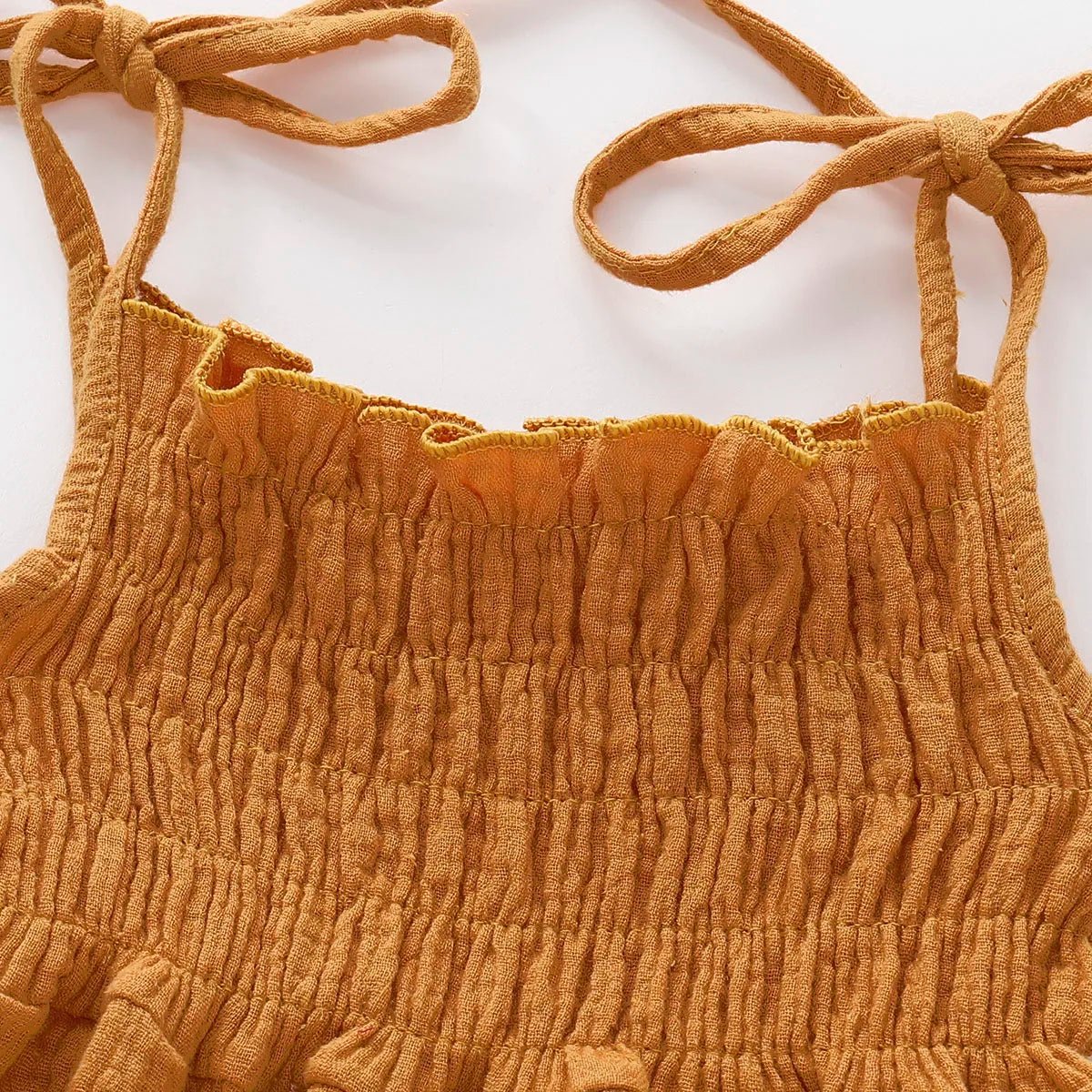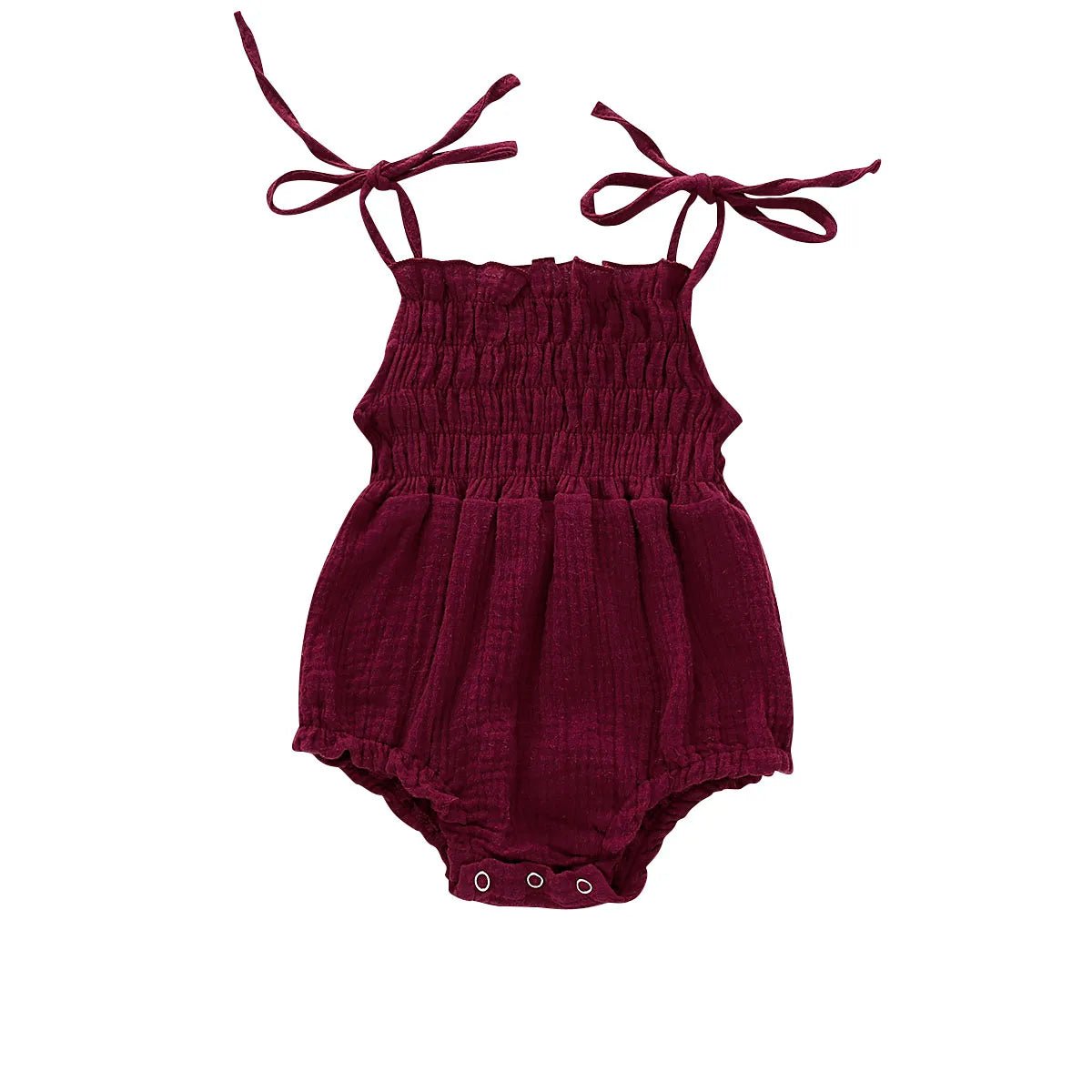 This Ruched Bubble Romper combines fashion and comfort for your little one. The ruched bodice and tie shoulder detail add trendy style while the soft muslin-like material provides ultimate comfort. Perfect for babies and toddlers, this romper is a must-have for any stylish and practical wardrobe.