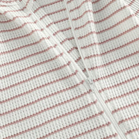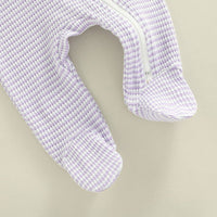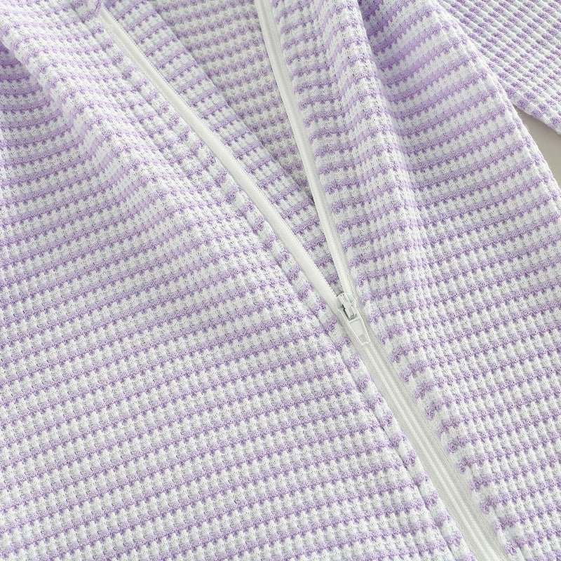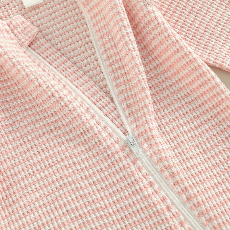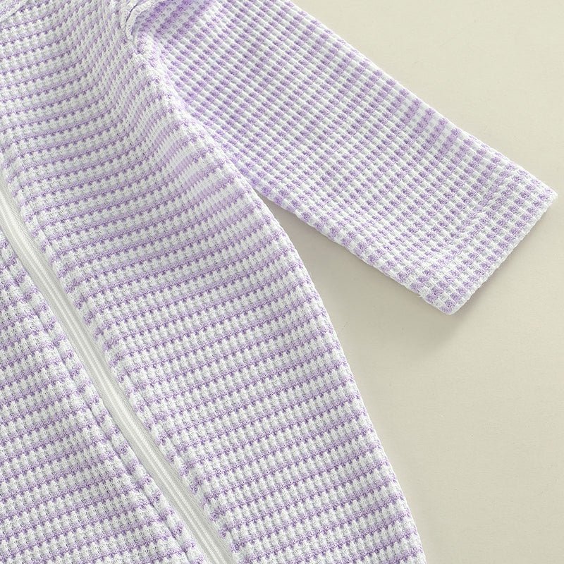 Crafted from soft waffle material, this footie features a subtle stripe pattern that adds gentle texture without overwhelming. Designed for baby girls, it includes delicate ruffle shoulders and a coordinating bow for an extra touch of sweetness. The convenient zipper closure ensures easy dressing and diaper changes, combining comfort with practicality for your little one’s everyday wear.