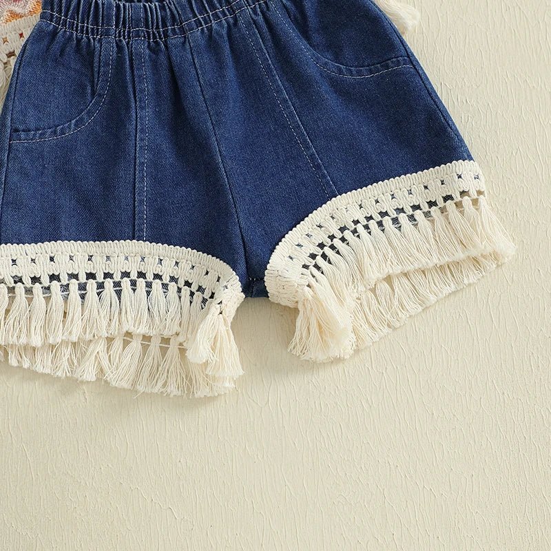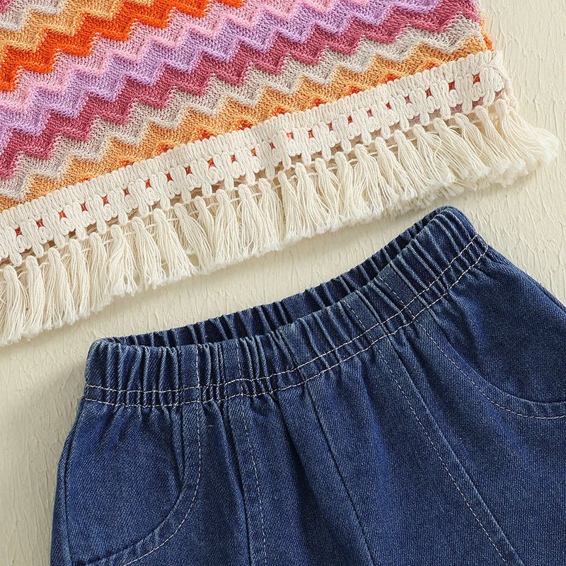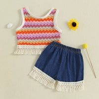 This retro-cute outfit pairs a vibrant zigzag knit tank with delicate fringe trim and coordinating denim lace-trim shorts. It’s a playful, vintage-style set perfect for sunny day adventures.